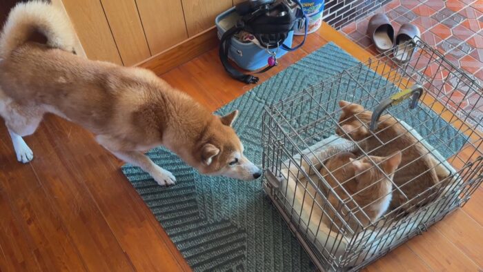 徐々に仲良くなってくれることを期待して柴犬と子猫達の同居生活が始まりました。
